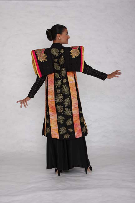 This is my 2008 Bernina Fashion Garment – It is made of black, fushia, gold and hand dyed silks. Metallic threads, gold beads and crystals. The pattern for the leaves came from my oak trees. I enjoyed working on it and was thrilled to see it on the runway in Houston.